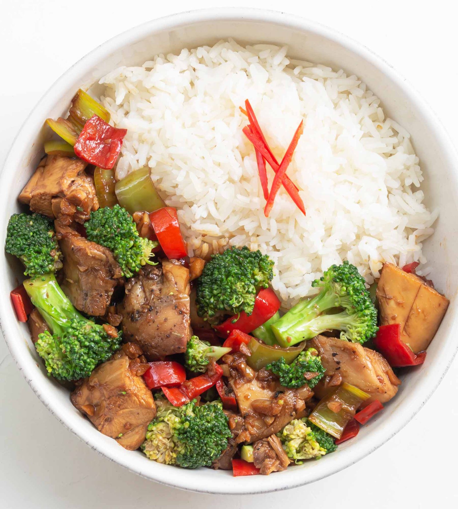 A delicious medley of stir-fried crisp vegetables with chicken served over a bed of Jasmine rice. You may substitute chicken with beef or shrimp at no additional charge. Please indicate in special instructions if you prefer beef or shrimp. Please note minimum 5 of this hot entree must be ordered for order to be filled.