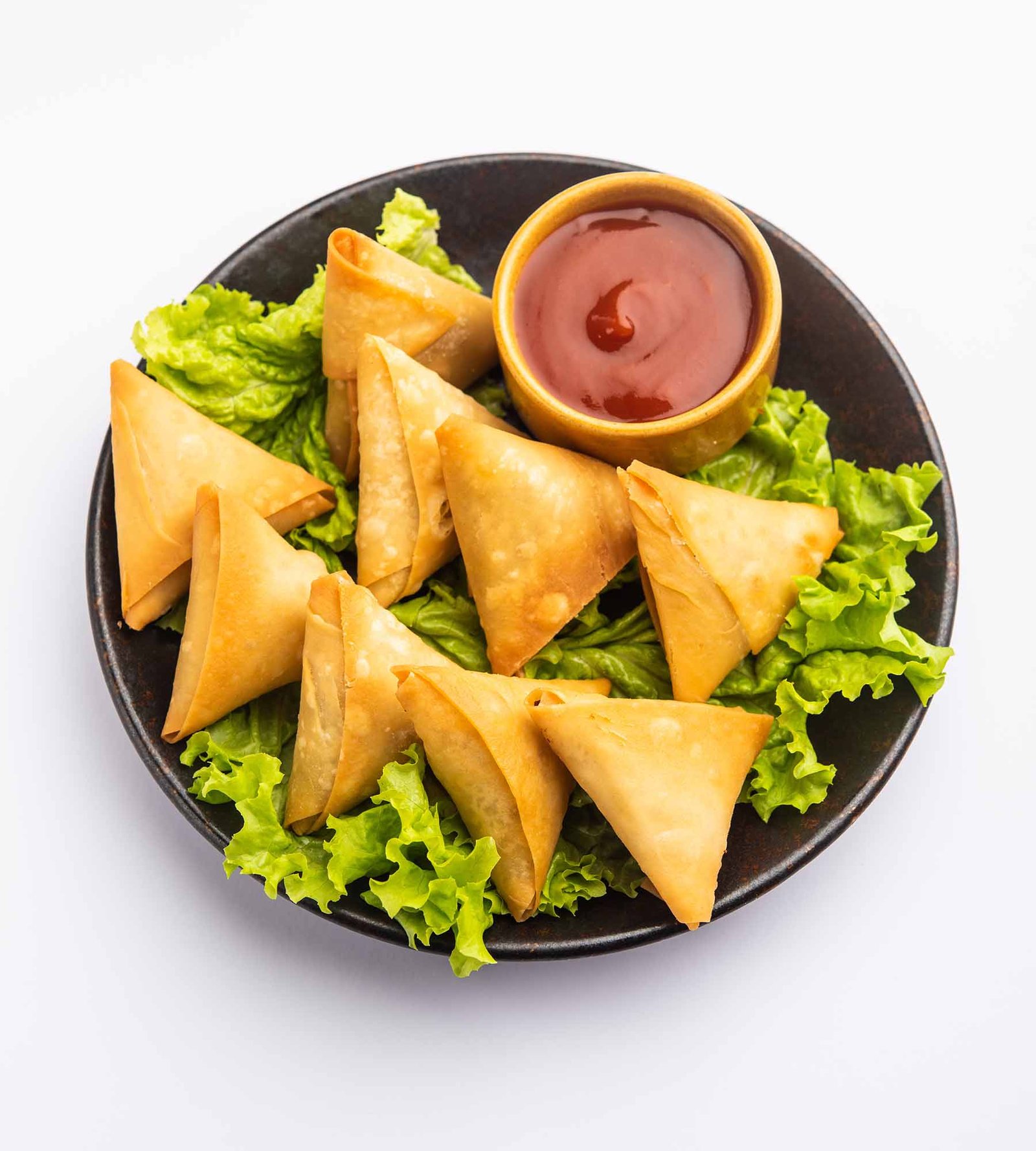 Delicious potato and pea filling served with mango chutney.