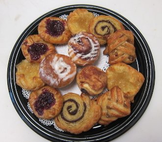 A mix of baked goods including danishes, croissants, muffins, cookies.